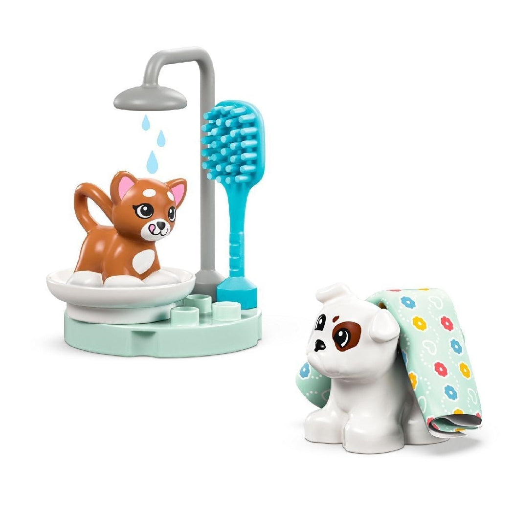 Toddlers use the toy stethoscope, weigh the animal figures on the scales, brush them and give them a shower, and tuck them into the cradle to rock them to sleep.
