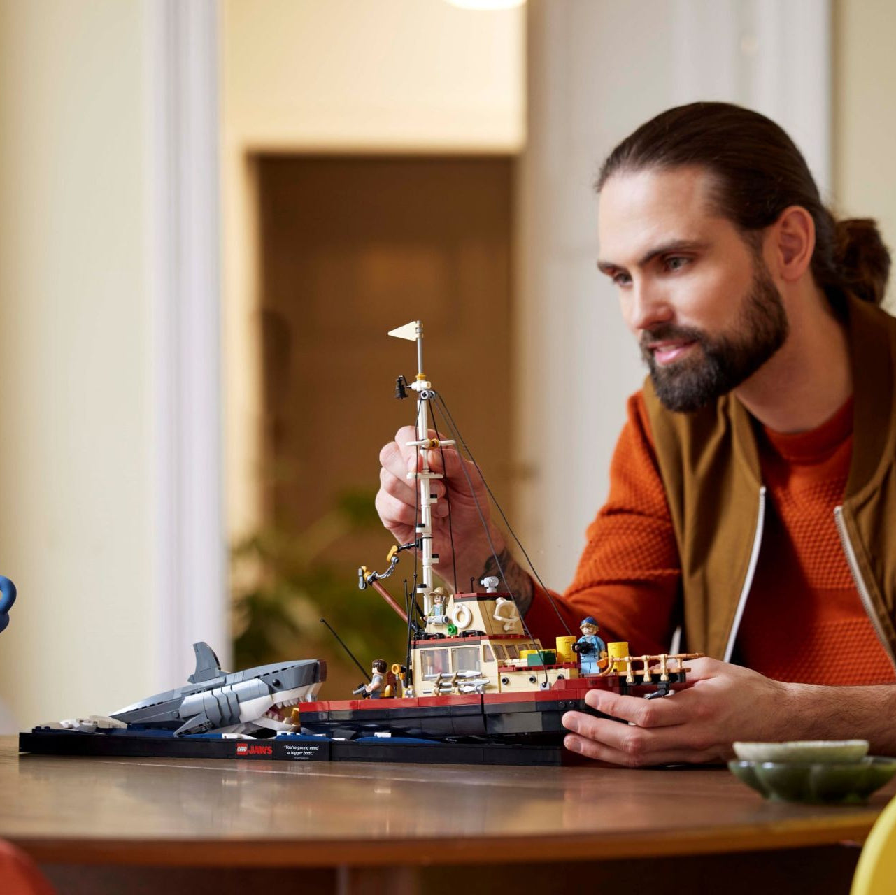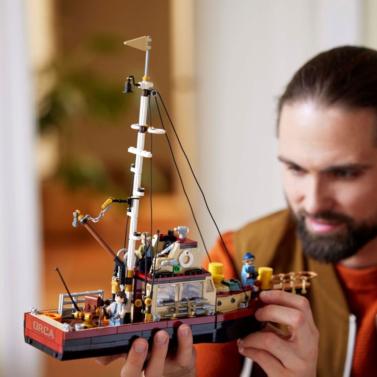 This authentically detailed LEGO® 21350 Ideas Jaws and Orca boat diorama kit for adults.