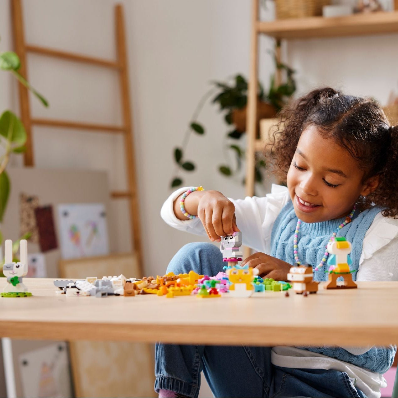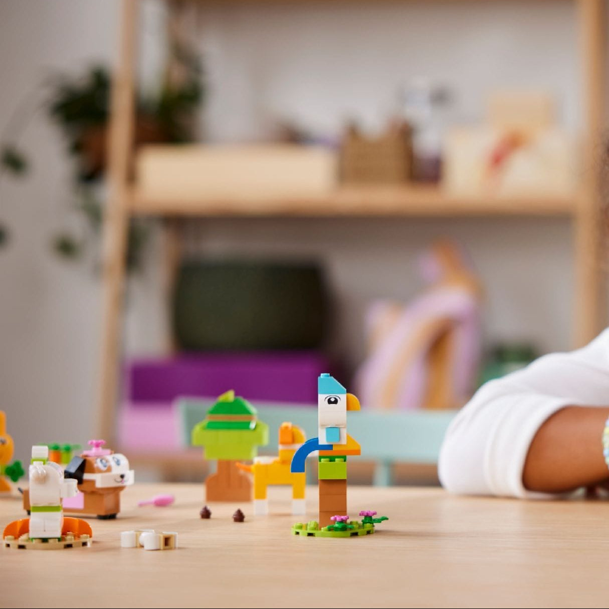 Kids can build a cat on a stand, a dog with a bowl and bone, a hamster with an apple, a rabbit with a carrot and a bird on a perch.