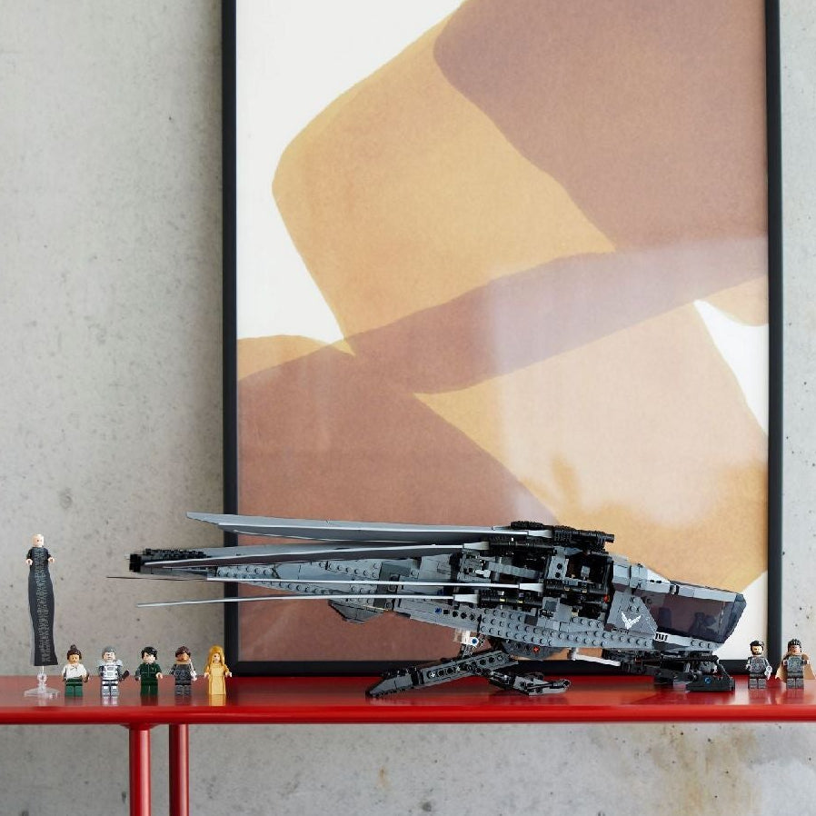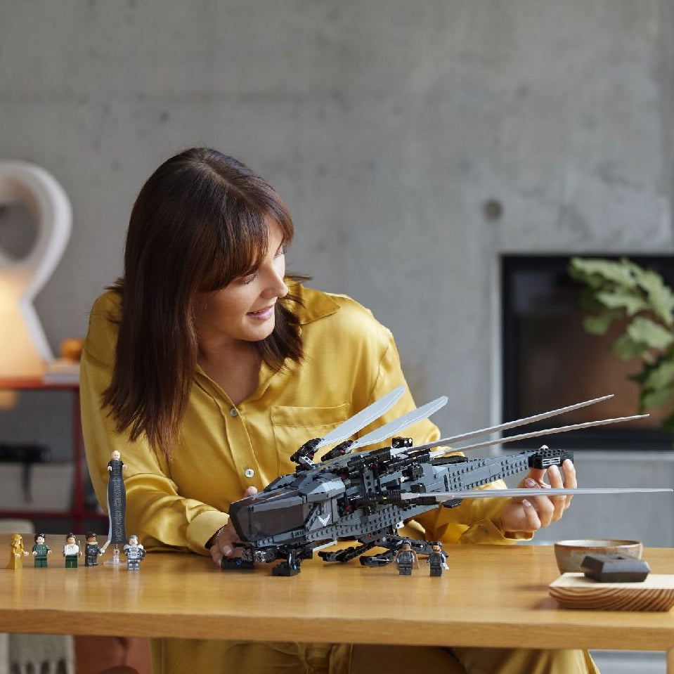 Everything you need to craft a LEGO® 10327 replica of the Dune Atreides Royal Ornithopter aircraft with foldout, flappable wings and deployable landing gear, plus 8 movie minifigures.