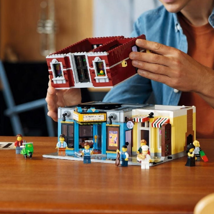 This building set is packed with detailed sections, including a pizzeria, a tailor’s workshop and the jazz band’s dressing room.