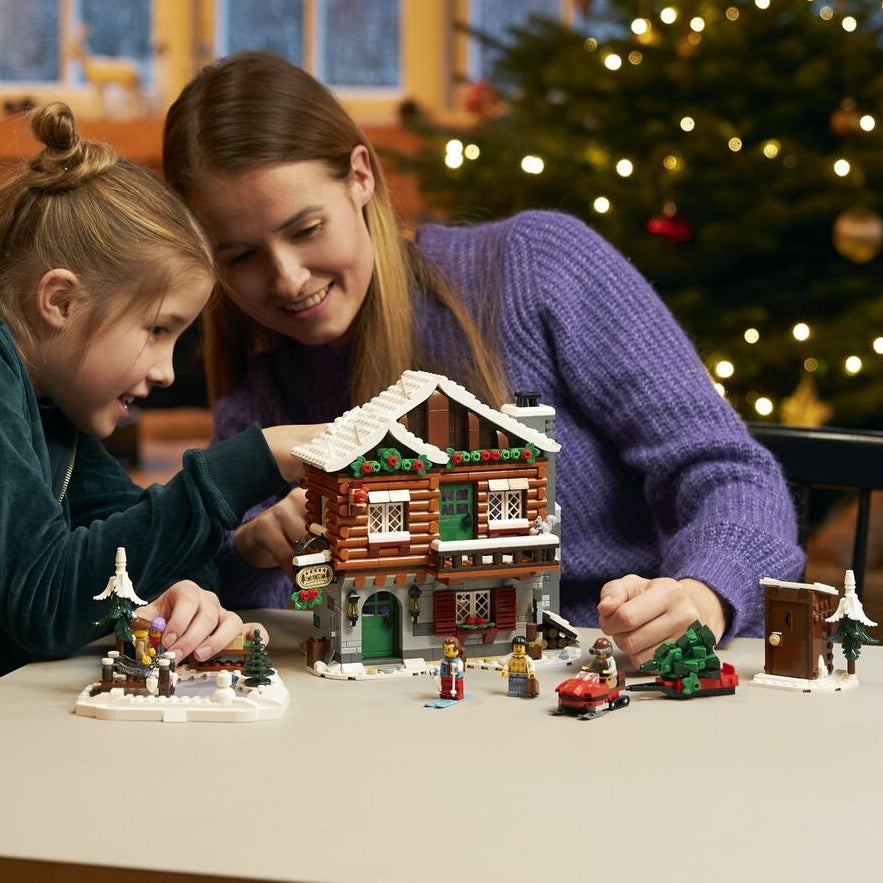 All you need to build the 3 storey alpine lodge, outdoor skating area, toilet cabin, snowmobile and trailer, plus a Christmas tree, 5 minifigures and cat, squirrel and bird figures.