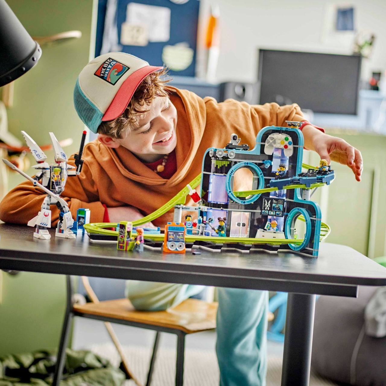 Features include a working 3 car roller coaster train, a posable mech with a minifigure seat and toy arcade video gaming consoles.